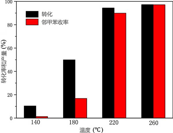 為了評價制備的磷化鎳活性炭的有用性,進行對生物油模型化合物加氫脫氧的活性。在測試中,我們使用SA(水楊醛)作為熱解油的代表性組分來探索加氫脫氧途徑。在這項工作中,SA轉(zhuǎn)化為鄰甲酚可以通過路徑氫化/氫解或C=O鍵的直接氫解進行。圖2顯示了加氫脫氧相對于鎳的轉(zhuǎn)化率和產(chǎn)率活性炭受反應(yīng)溫度影響。結(jié)果表明,隨著反應(yīng)溫度的升高,SA的轉(zhuǎn)化率和鄰甲酚的收率逐漸增加。當(dāng)反應(yīng)溫度為260℃時,鄰甲酚目標(biāo)產(chǎn)物的產(chǎn)率較大,2小時達到97.1%,這表明反應(yīng)溫度顯著提高了它的區(qū)域選擇性加氫脫氧的催化活性。